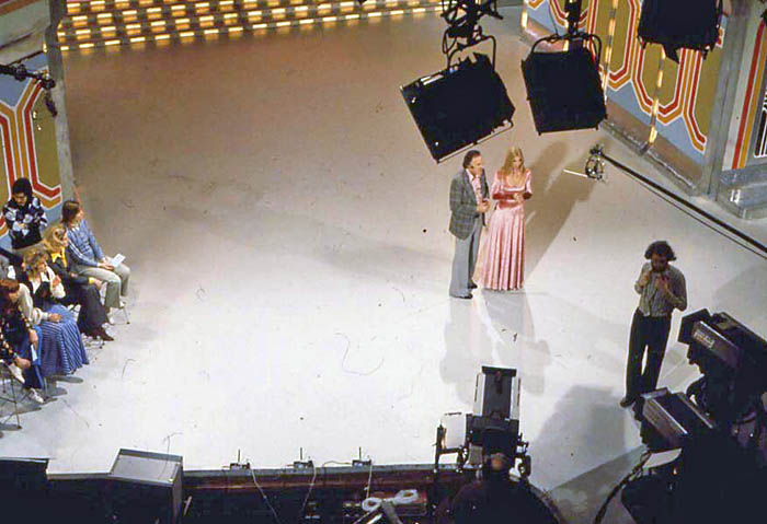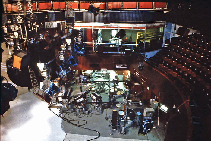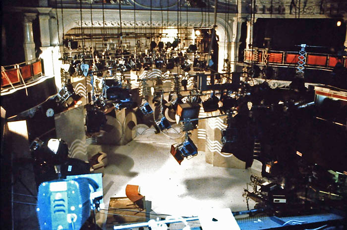 The centre tracking line was invariably occupied by a camera crane or motorised dolly – from the late ’60s usually an MPRC ‘Mole’ crane. The crane had a protective steel bar around the cameraman’s head to prevent him from being decapitated by the dress circle during over-enthusiastic track-outs. The Mole could track back to beneath the dress circle to give wide shots of the whole stage (with the band room on the right and the audience about three feet lower on the left.) By panning left the camera could take shots of the stalls audience and by craning up and looking back could also take shots of the audience sitting in the dress circle.