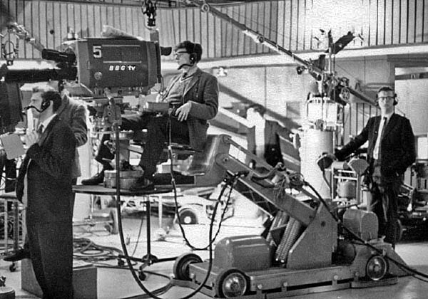 This picture was taken on 8th December 1964 and shows Tim Healy and Dave Lawson of crew 4 on a motorised Vinten. In later years this dolly was replaced with an MPRC Mole crane.