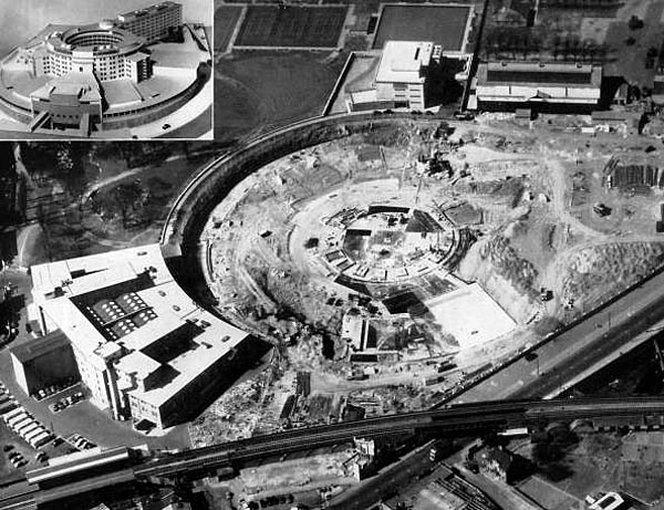 The site in 1957 – only stages 1 and 2 (the scenery block and the restaurant) are complete.