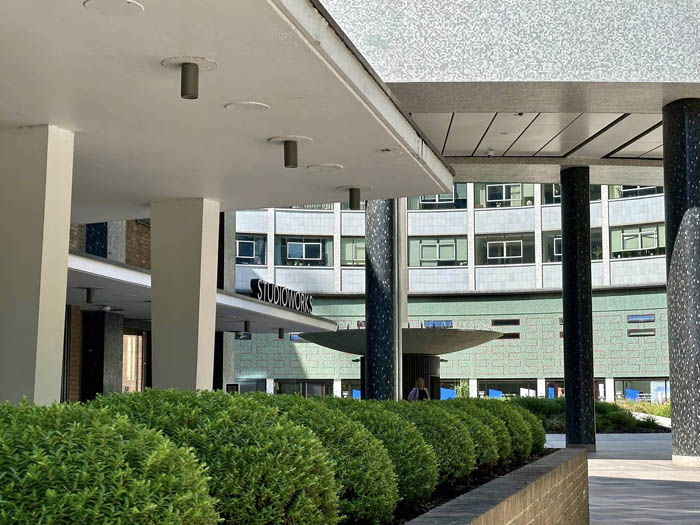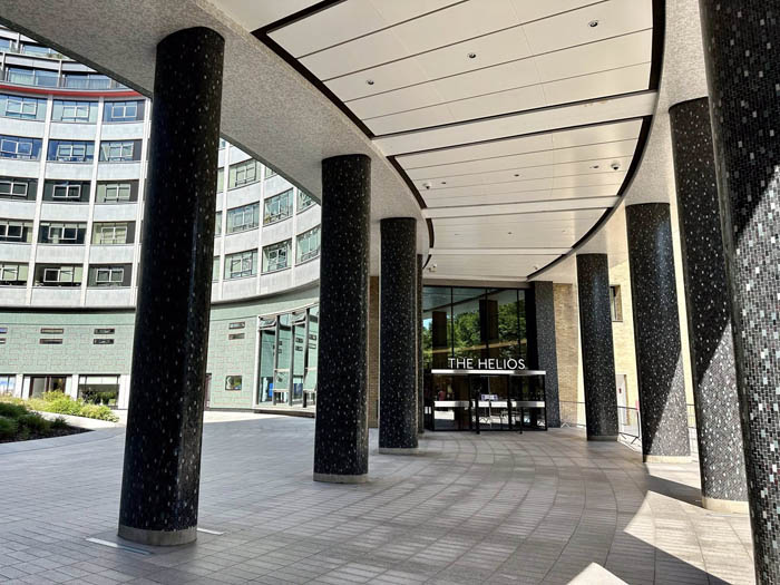 The colonnade in 2025.  The original TVC main reception is now the reception for the serviced flats.  The interior has been preserved, you’ll be relieved to hear.