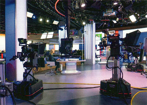 They have also built ‘Sky Central’ – a block containing offices (of course) but also a superb subsidised staff restaurant on the ground floor. Not only that, but it contains a luxury cinema for the use of staff and their families. Within the central atrium is a mezzanine upon which is sited the main Sky News studio. The remotely controlled cameras are suspended from the ceiling rather than on peds – which is something I’ve never seen before. The pictures from this studio look clean, light and airy and very different from the pictures in the old studio with its colourful red/blue set.