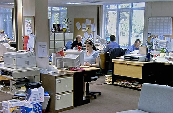Graham Collins has kindly written to me. He worked on refurbing the offices and recalls that they were also used as production offices for Today With Des and Mel. He tells me that for series 2 there was a plan to build a second identical set on the floor above. By then the Chinese Channel had moved in (they had a studio at Teddington) but in the end they were compensated with a sum of money to move out for six weeks for the Office shoot, so the original set was used again.